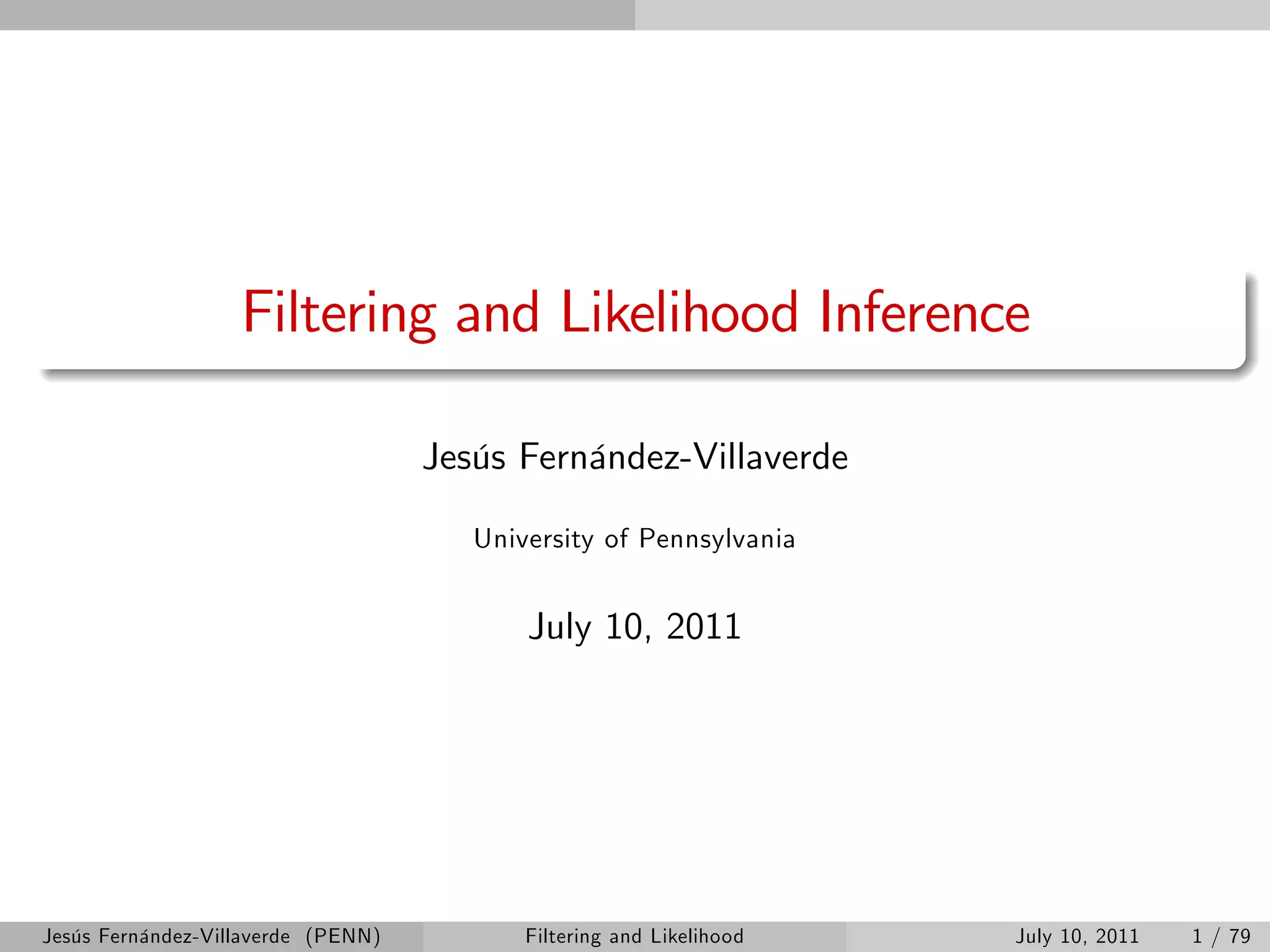 This document discusses filtering and likelihood inference. It begins by introducing filtering problems in economics, such as evaluating DSGE models. It then presents the state space representation approach, which models the transition and measurement equations with stochastic shocks. The goal of filtering is to compute the conditional densities of states given observed data over time using tools like the Chapman-Kolmogorov equation and Bayes' theorem. Filtering provides a recursive way to make predictions and updates estimates as new data arrives.
