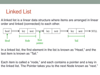 A linked list is a linear data structure where elements (nodes) are linked in sequence, with the first element as 'head' and the last as 'tail'. Java's LinkedList class provides various methods for adding, accessing, changing, and removing elements, as well as supporting different types of linked lists such as singly, doubly, and circular linked lists. Each type of linked list has distinct characteristics and traversal mechanisms, with specific examples provided for each implementation.