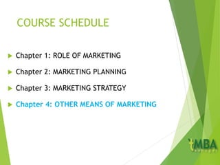 The document outlines key topics in marketing covered in Chapter 4, including branding, pricing strategies, international marketing, and e-commerce. It defines branding and the different types, discusses using pricing strategies to gain competitive advantages, notes the opportunities and challenges of expanding business internationally, and describes the two main forms of e-commerce as business-to-business and business-to-consumer models.