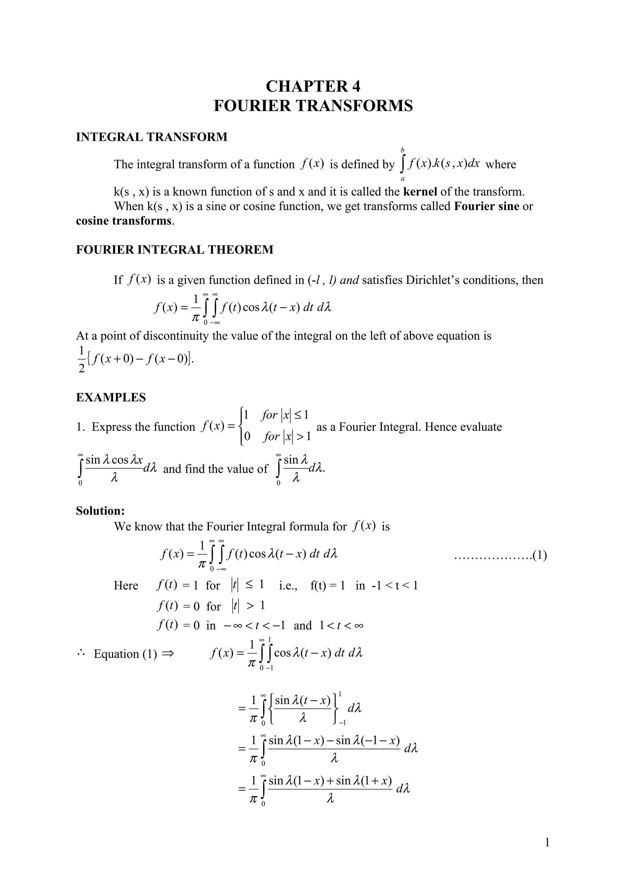 The document provides information about Fourier transforms. It defines the Fourier integral transform using a kernel function k(s,x). It presents the Fourier integral theorem relating a function f(x) to its Fourier integral. It gives examples of using the Fourier integral formula to express functions as Fourier integrals and evaluates related integrals. It also defines the complex form of Fourier integrals and Fourier transforms, and presents the inversion formulas. It discusses Fourier sine and cosine transforms and their inversion formulas. It provides problems demonstrating the use of Fourier integral and transform formulas to represent functions and prove identities.