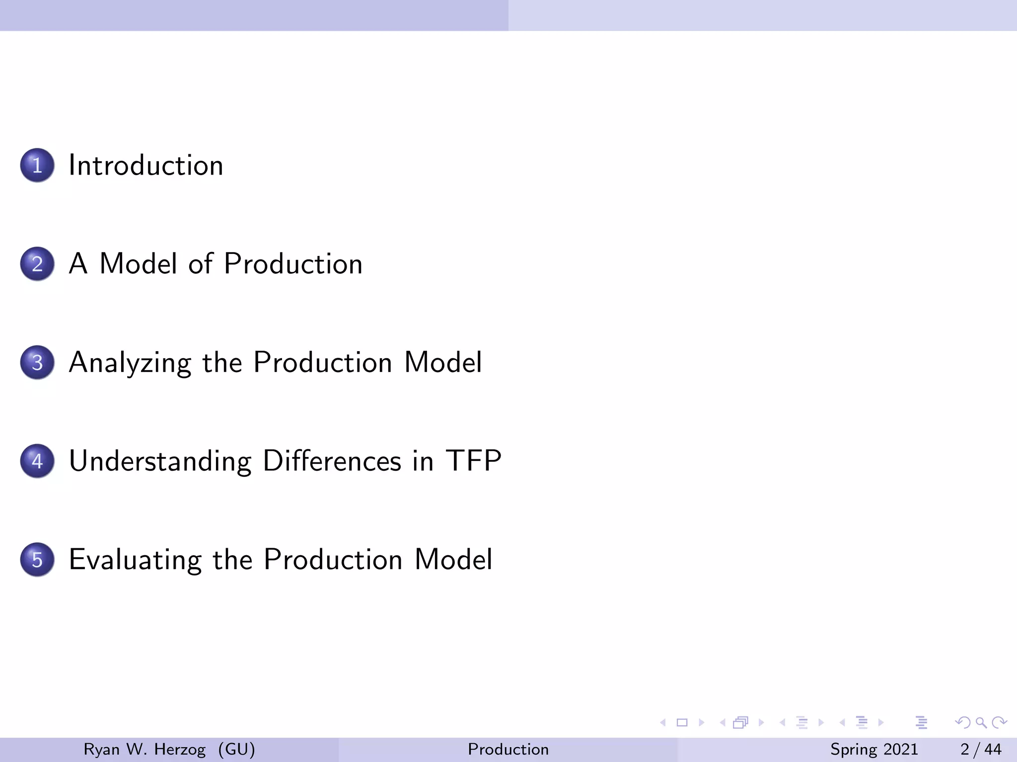 This document provides an overview of a macroeconomic model of production. It introduces a Cobb-Douglas production function to model how output is determined by capital and labor inputs. The model assumes constant returns to scale and is solved to find the equilibrium levels of output, capital, labor, wage rates and rental rates. The model predicts that countries with more capital per person will have higher output per person. However, the model initially overpredicts output for many countries. Accounting for differences in total factor productivity across countries significantly improves the model's predictive power.