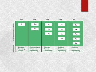 The document discusses normalization and relational algebra. It defines normalization as a process of structuring a database into tables to reduce data redundancy and inconsistencies. The document covers various normal forms including 1st normal form (1NF), 2nd normal form (2NF), and 3rd normal form (3NF). It defines functional dependencies and different types of dependencies and anomalies. Examples are provided to illustrate how to determine the normal forms of relations and decompose relations to higher normal forms by removing dependencies.