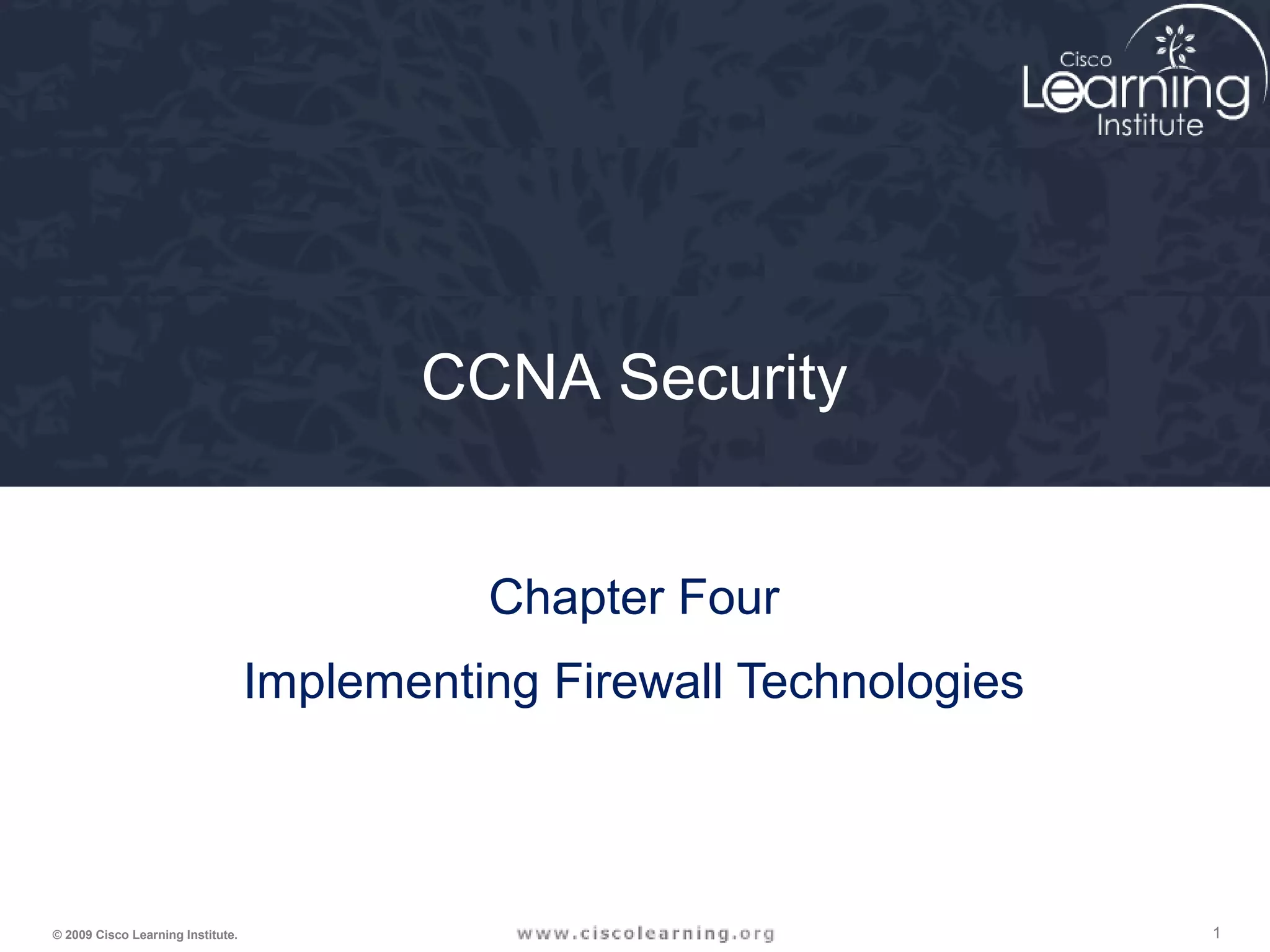 This document provides information about implementing firewall technologies in Cisco devices. It includes details on configuring and applying access control lists (ACLs) using both the command line interface and the Security Device Manager. Standard and extended ACLs are described, as well as techniques such as reflexive ACLs, dynamic ACLs, time-based ACLs, and Context-Based Access Control. The document provides configuration examples and guidelines for applying different types of ACLs in network devices.