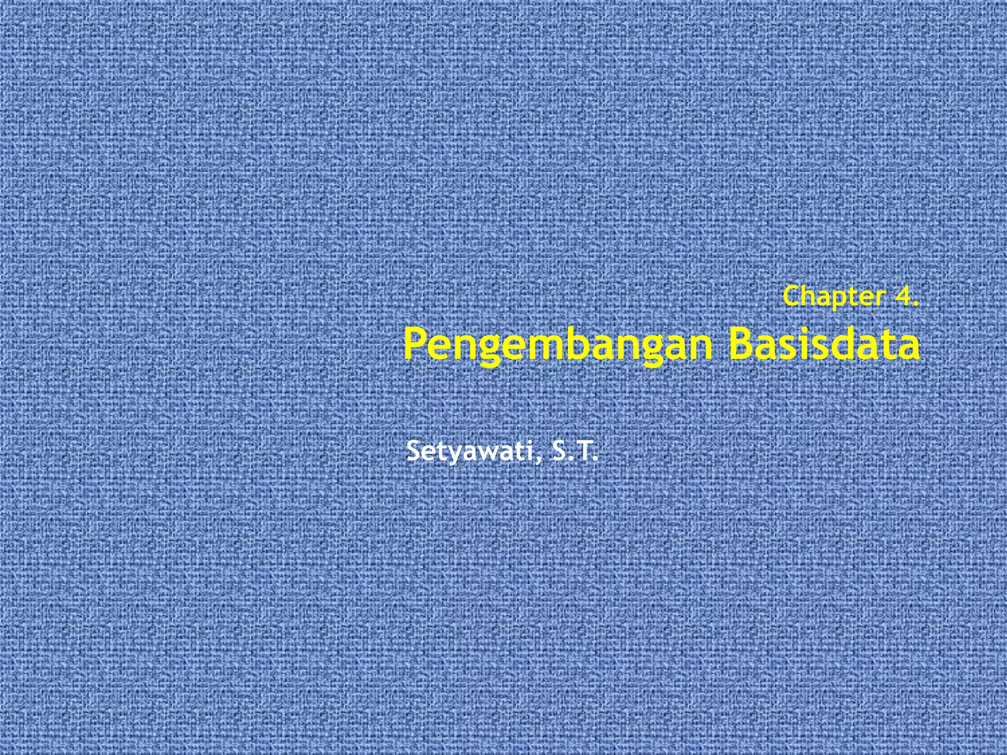 Dokumen ini membahas tentang pengembangan basisdata, termasuk tujuan dan dua pendekatan utama yaitu top down dan bottom up. Proses pengembangan melibatkan tahapan seperti analisis kebutuhan pengguna, pemodelan data, implementasi, testing, dan distribusi sistem. Tugas utama dalam setiap tahapan seperti kebutuhan pengguna, desain, dan pemeliharaan basisdata ditangani oleh Database Administrator (DBA) dan programmer.