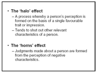 The document provides information about perception and decision making. It defines perception as how individuals organize and interpret sensory information to make meaning of their environment. It discusses factors that influence perception, including the perceiver, the target, and the situation. It also outlines theories of attribution, selective perception, halo effects, and stereotyping. The document then discusses social identity theory and how people make internal and external attributions. Finally, it discusses rational decision making by outlining the steps of that process and concepts of bounded rationality and factors that influence ethical decision making.
