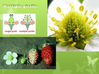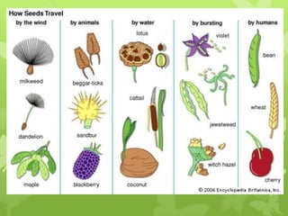 Plant reproduction can occur through sexual or asexual means. Sexual reproduction involves flowers and production of seeds, while asexual reproduction is vegetative and involves propagation through stems, leaves, or underground structures. The life cycle of flowering plants includes germination of seeds into seedlings, growth and maturation of plants, flowering, pollination and fertilization to produce seeds which then disperse and the cycle continues. Fruits aid in seed dispersal through various adaptations for wind, animal, or explosive dispersal. Genetically modified crops aim to introduce traits like pest resistance, disease resistance, drought tolerance, and increased nutrients, in order to address issues around food security. However, GM crops also face opposition around safety and environmental concerns.