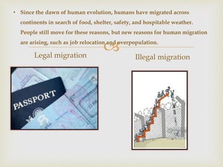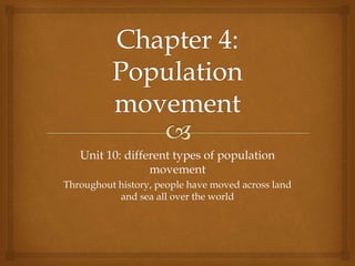 This document discusses different types of population movement. It describes voluntary and forced migration, with voluntary migration occurring when people move themselves for reasons like employment, family, or amenities, and forced migration resulting from issues like war, unsafe conditions, or natural disasters. The document also outlines several specific types of migration, including international migration (emigration and immigration), regional migration, rural-urban migration, and urbanization. Overall, the document provides an overview of the various ways people can migrate and the reasons that drive different population movements.