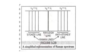 The document discusses Raman spectroscopy, which analyzes the scattering of light by molecules rather than light absorption. When a sample is irradiated with monochromatic light, most light is Rayleigh scattered at the same frequency, but a small amount is Raman scattered at lower (Stokes) or higher (anti-Stokes) frequencies. The frequency shift between incident and scattered light is independent of the incident light frequency and depends on molecular structure. Raman scattering occurs due to changes in molecular polarizability during vibrations or rotations. Spectra provide information about molecular vibrational and rotational energy levels.