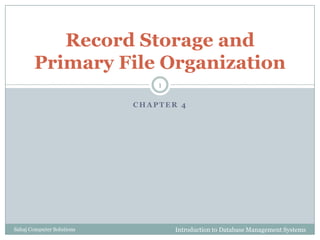 This document discusses file organization and storage in a database management system. It describes how records are stored on secondary storage devices like disks and tapes. Records can have fixed or variable lengths and are organized into files. The document explains how disks are organized into tracks and sectors and how buffers in memory are used to improve performance when accessing multiple disk blocks.