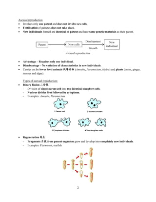 1) The document discusses sexual and asexual reproduction in humans. Sexual reproduction involves the fusion of male and female gametes during fertilization, while asexual reproduction involves only one parent and does not involve gametes.