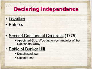 1) The document summarizes key events from the American Revolution through the drafting and ratification of the US Constitution, including the Declaration of Independence, Articles of Confederation, Constitutional Convention, and addition of the Bill of Rights.