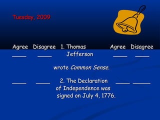 The document discusses Thomas Paine's pamphlet "Common Sense" which attacked King George III and argued for American independence. It then explains that the Second Continental Congress decided to write a formal declaration of independence in 1776, selecting Thomas Jefferson to write it. The declaration had four parts: an introduction, a statement of rights declaring all men equal, a list of grievances against the King, and a formal declaration of independence. If captured by the King, the men who signed the declaration would have faced severe punishment.