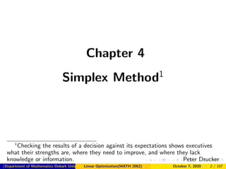 This document provides an overview of Chapter 4 on the Simplex Method for solving linear programming problems. It begins with an introduction to the simplex method and its development by George Dantzig. The chapter outline lists topics like linear programs in standard form, basic feasible solutions, and the simplex algorithm. It then discusses concepts such as slack and surplus variables, and conditions for applying the simplex method. Examples are provided to demonstrate converting problems to standard form and finding basic feasible solutions. The summary provides a high-level view of the key topics and concepts covered in the chapter on using the simplex method to solve linear programs.