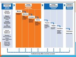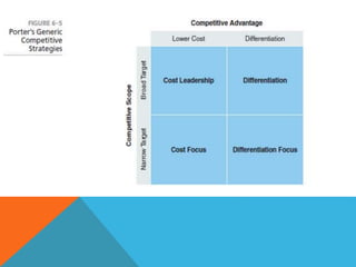 The document discusses various strategic management tools and techniques for analyzing a company's strategy, including the Quantitative Strategic Planning Matrix (QSPM) method. The QSPM uses inputs from external/internal factor analyses to objectively evaluate and select between alternative strategies. It compares strategies based on how well they capitalize on critical success factors identified in earlier analyses. The document also covers generating strategies using a TOWS matrix, competitive strategies like differentiation and lower cost, competitive tactics involving timing and market location, and cooperative strategies such as strategic alliances and collusion.