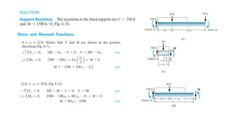 2) Shear and moment functions vary across a member depending on the type and location of loads. They can be determined by drawing free body diagrams of small segments.