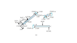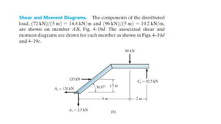 3) Shear and moment diagrams are created by plotting the variation of shear and moment across a member. Examples show how to construct these diagrams for beams and frames.