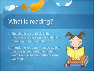 Reading involves decoding words and comprehending meaning. It requires knowledge of language, reading strategies, and background knowledge. Developing literacy in a native language first makes learning English literacy easier by transferring skills like decoding, comprehension, and reading for pleasure or information. Effective reading instruction incorporates phonics, sight words, predictable books, a print-rich environment, and comprehension strategies. Picture books engage young learners and support developing literacy.