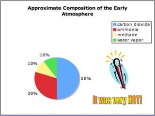 The document discusses the composition and evolution of Earth's atmosphere. It notes that nitrogen makes up 78% of the atmosphere, while oxygen is 21% and other gases like argon and carbon dioxide make up the remaining 1%. Earth originally had an atmosphere of hydrogen and helium that eventually escaped. Later, volcanoes released water vapor, carbon dioxide, and ammonia, forming a second atmosphere. Cyanobacteria introduced oxygen to the atmosphere between 3.3 to 2.2 billion years ago. The modern atmosphere of nitrogen and oxygen is considered the third atmosphere and has a composition influenced by biological and geological processes.
