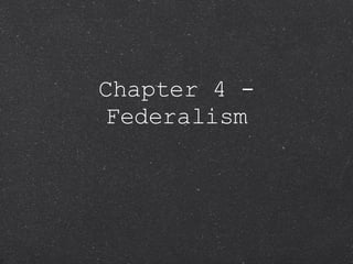 Federalism is a system that divides power between a central/national government and regional/state governments through a written constitution. The constitution assigns specific expressed powers to the national government like taxes and defense. It assigns implied and inherent powers as needed and reserves non-mentioned powers to the states. Concurrent powers like transportation can be shared while exclusive powers like treaties belong solely to the national level. Federalism requires the national government guarantee aspects like republican government and protection to states.