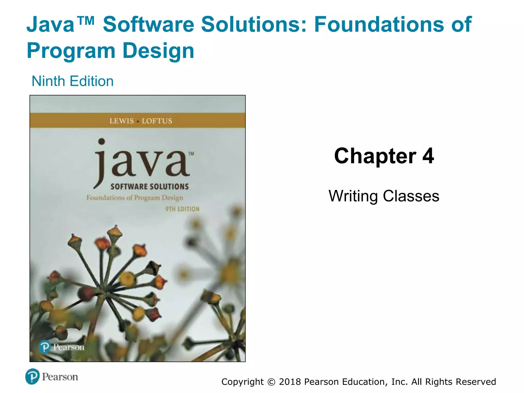 The document discusses writing classes in Java. It covers defining class structures with data declarations and method declarations, using classes as blueprints for objects with state and behavior, and instance data that each object has its own copy of. It provides examples of classes like Student and Die. Key concepts covered include scope of data, UML class diagrams, constructors for initializing objects, and encapsulation.