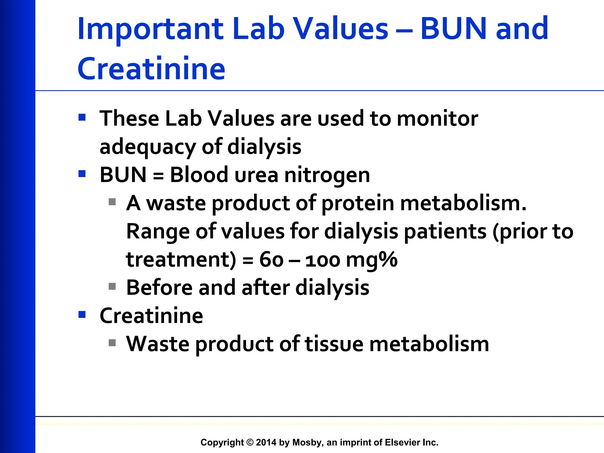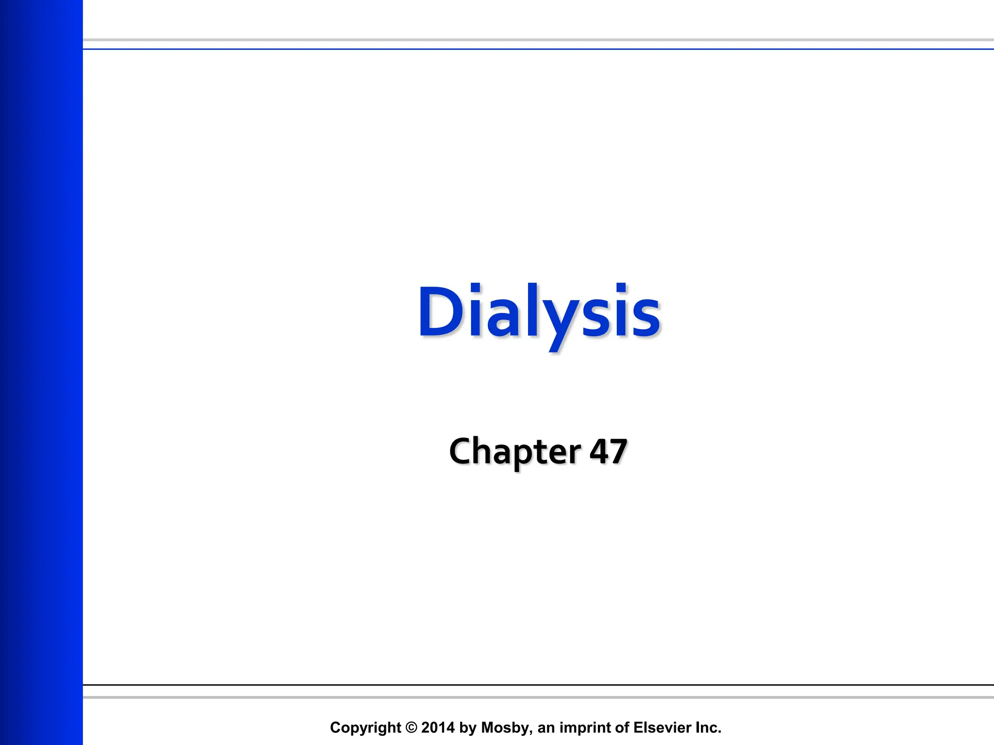 The document provides an overview of dialysis, including important lab values for monitoring patients, the types and principles of dialysis methods such as peritoneal and hemodialysis, and their respective procedures and complications. It emphasizes the significance of maintaining proper electrolyte balance and the role of dialysis in treating end-stage kidney disease (ESKD) when renal function declines. Additionally, it covers nursing interventions and considerations for medication management in dialysis settings.