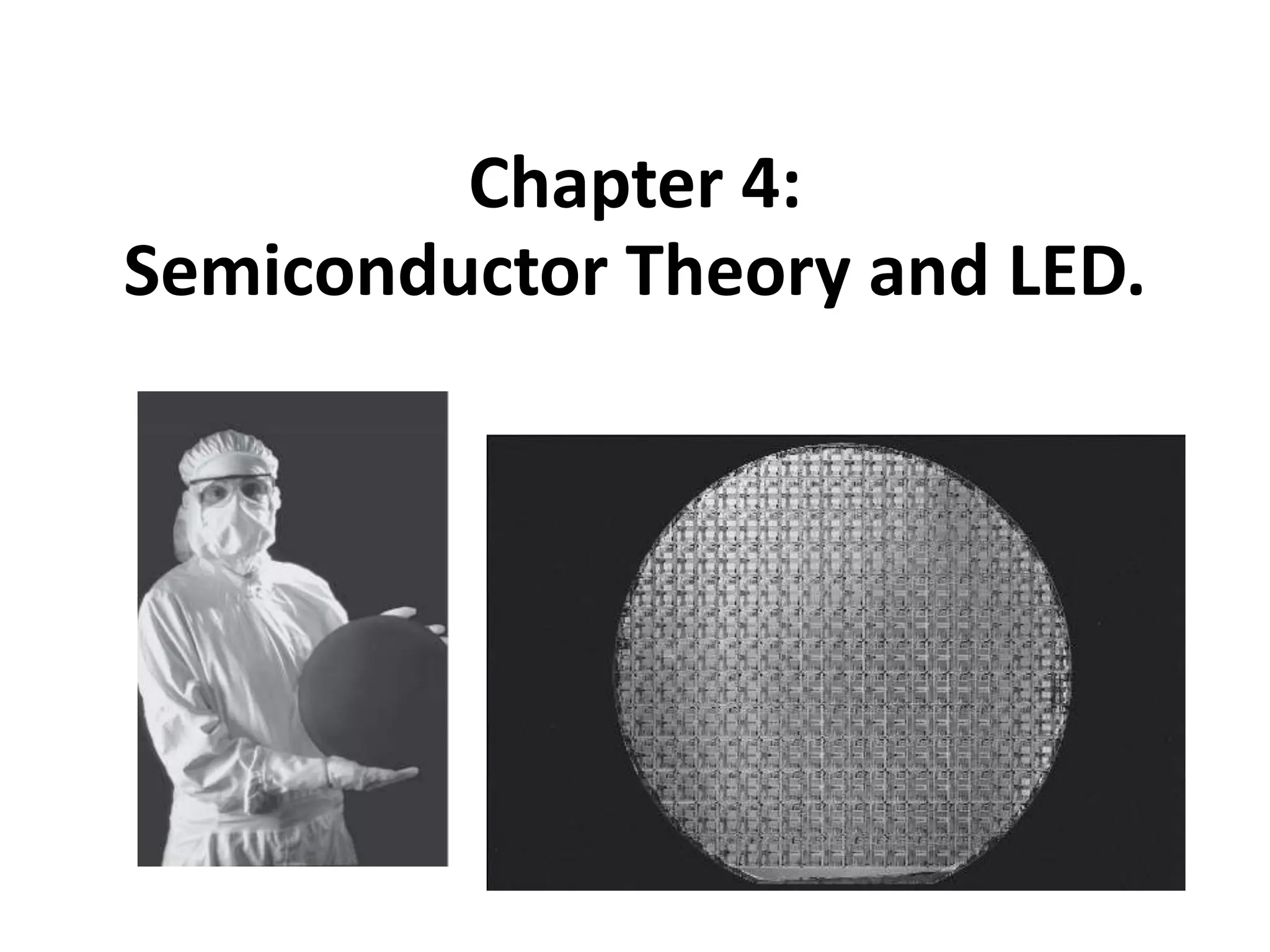 This document discusses semiconductor materials and their properties. It covers elemental and compound semiconductors, including gallium nitride used in LEDs. It describes the band structure of semiconductors including the valence and conduction bands separated by the bandgap. Carrier generation and recombination processes are explained. Intrinsic and extrinsic semiconductors are defined based on their carrier concentrations.