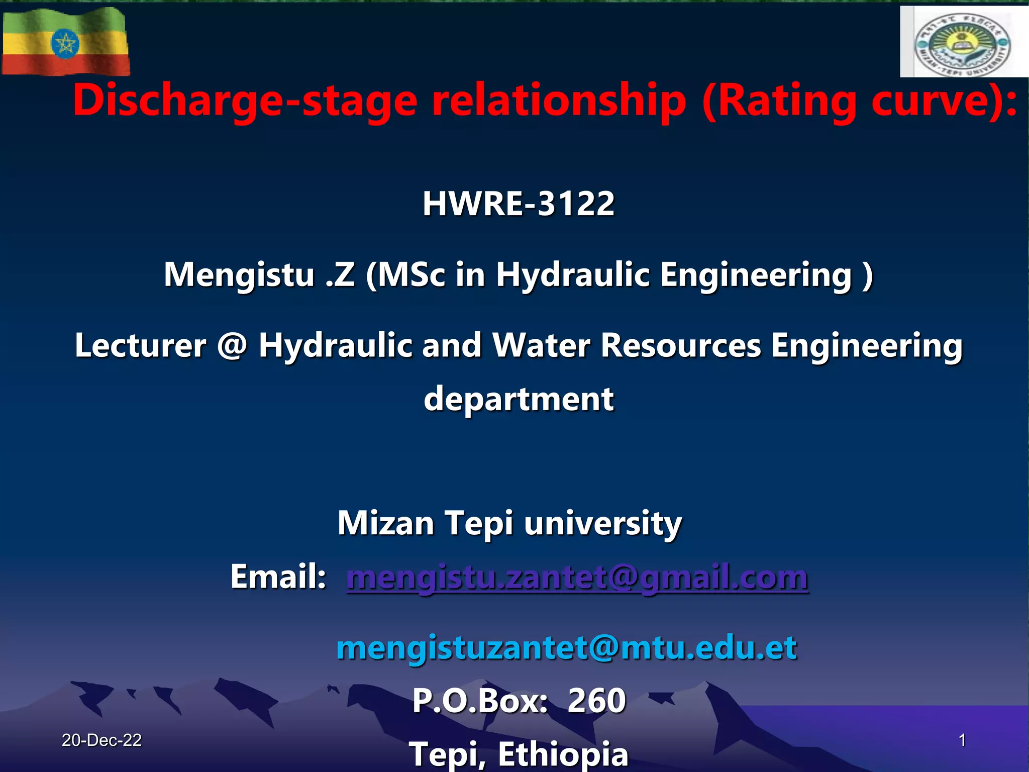 The document discusses techniques for developing discharge-stage relationships (rating curves) at hydrometry stations. It covers permanent and shifting control rating curves, methods for extending rating curves like conveyance and logarithmic plotting, and considerations for siting hydrometry stations according to World Meteorological Organization criteria. Examples are provided to illustrate calculating rating curves and addressing shifting control due to backwater effects. The overall aim is to accurately measure stream discharge, a key parameter in hydrologic studies.