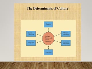 This document discusses differences in cultures and provides an overview of key cultural concepts. It defines cross-cultural literacy as understanding how cultural differences can affect business practices. Culture is described as a system of shared values and norms that constitute a design for a group. Different types of social norms like folkways and mores are presented, along with how society, nation states, and individualism vs group orientation relate to culture. The document also discusses social stratification through caste/class systems and the significance of stratification on issues like social mobility and class consciousness. Finally, it provides brief descriptions of religion and ethical systems.