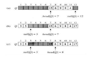 This chapter discusses various data structures including elementary data structures like stacks, queues, linked lists, binary trees, and hash tables. It then describes more complex data structures like red-black trees that balance binary search trees to guarantee logarithmic time operations. It also discusses augmenting data structures by adding size fields to support dynamic order statistics queries in logarithmic time.