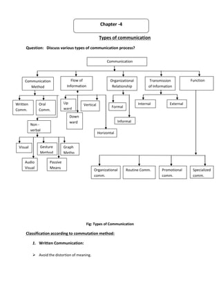 There are several types of communication. Written communication avoids distortion of meaning and provides a permanent record, but oral communication allows for easy response and motivation. Non-verbal communication uses symbolic methods like gestures. Communication can also be classified by its method (visual, audiovisual), flow of information (downward, upward, horizontal), relationship to the organization (formal, informal), and function (organizational, routine, specialized, promotional). Overall, the types of communication provide different benefits depending on the situation and goals.