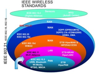The document provides an overview of various wireless standards organizations and their standards including IEEE 802.11 Wi-Fi, IEEE 802.15 Bluetooth, IEEE 802.16 WiMAX, 3GPP for cellular networks, and discusses wireless network architectures, protocols like WAP and Mobile IP for mobility, and the future of seamless connectivity across different wireless technologies.