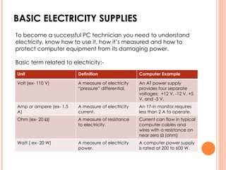 The document discusses electricity, power supplies, and common issues that can occur in a computer's electrical system. It provides definitions for basic electrical terms like volts, amps, ohms, and watts. It also explains the differences between alternating current (AC) and direct current (DC). Common electrical components like transistors, capacitors, diodes, and resistors are introduced. Potential causes of electrical issues in a computer are then outlined, like loose connections, overheating, and power supply problems. Steps for diagnosing power supply issues and protecting the computer system from electrical faults are recommended.
