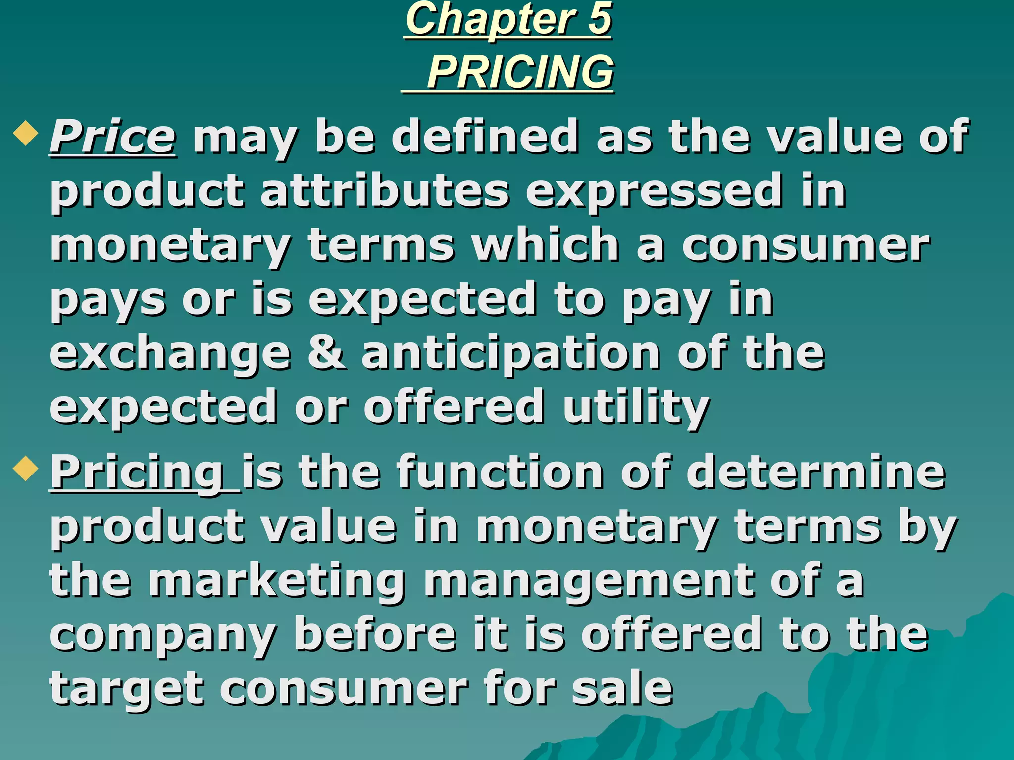 1. Pricing is determining the monetary value of a product for consumers and involves considering objectives like maximizing profits, competitive pricing, and market factors.