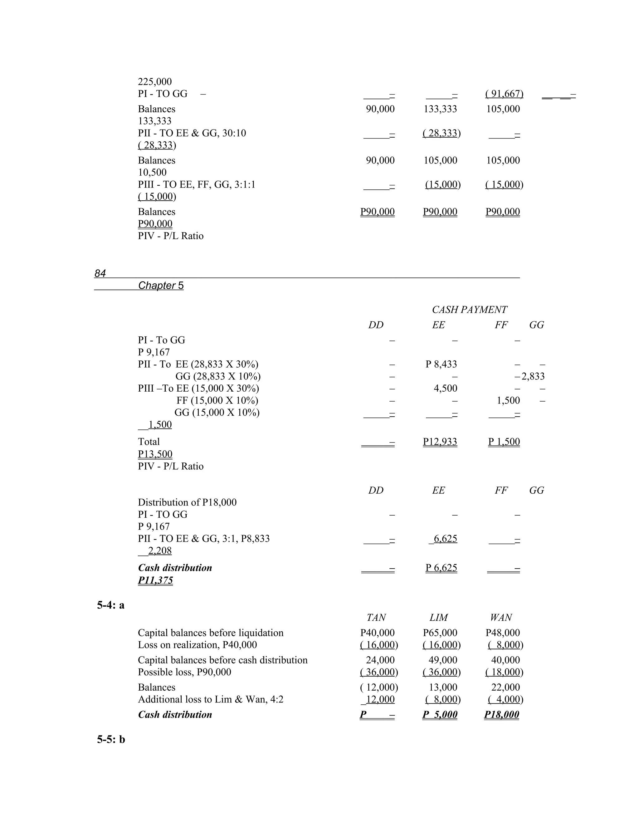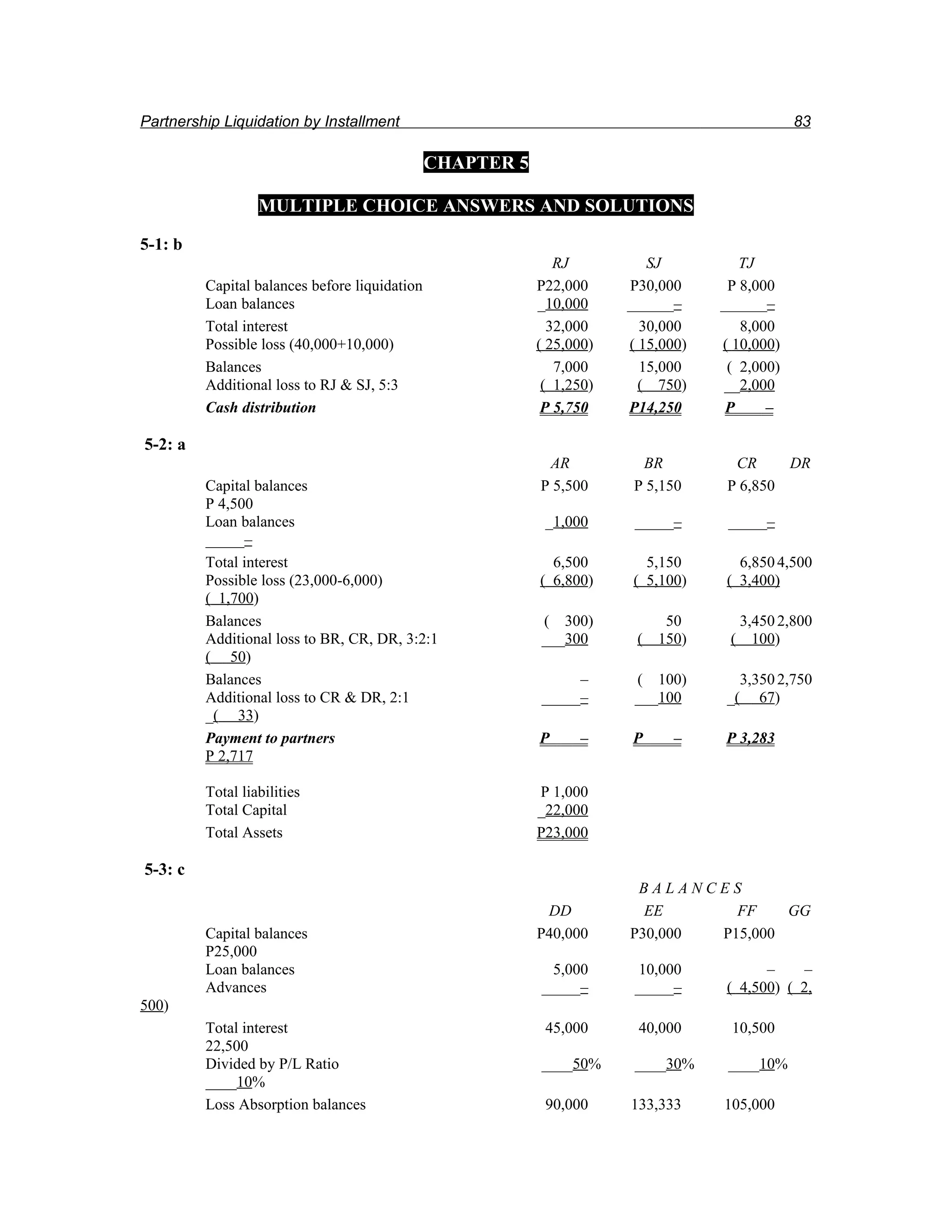 This document contains multiple choice questions and solutions for a chapter on partnership liquidation by installment. It includes examples of partnership liquidation scenarios showing capital account balances, loan balances, losses, and cash distributions for various partners. The examples are presented to test understanding of how losses are allocated and cash is distributed during partnership liquidations.