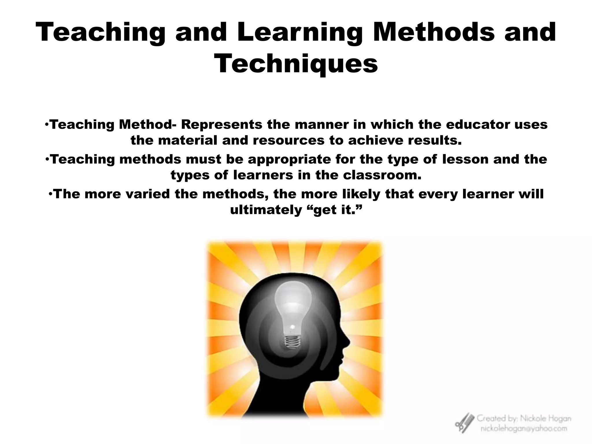 This document discusses various teaching methods and learning techniques that can be used in the classroom, including lecture, demonstration, discussion, role-playing, mind mapping, projects, case studies, visualization, stories, and energizers. It provides details on how to effectively implement each technique, with the overall goal of engaging students in active learning and helping them to retain the material. The key is for educators to use a variety of methods appropriate for the content and learners.