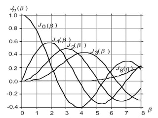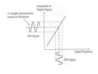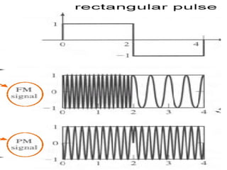 Angle modulation techniques such as frequency modulation (FM) and phase modulation (PM) were introduced. FM varies the carrier frequency according to the message signal, while PM varies the carrier phase. The chapter covered the concepts of instantaneous frequency, bandwidth of angle modulated signals, generation of FM signals through direct and indirect methods, and demodulation of FM signals using discriminators and phase-locked loops. Key advantages of FM over AM include improved noise immunity and resistance to interference at the cost of increased transmission bandwidth.