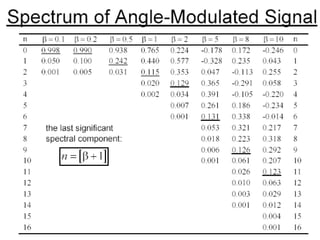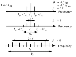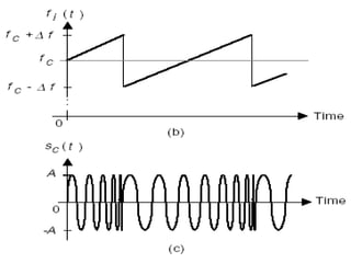 Angle modulation techniques of frequency modulation (FM) and phase modulation (PM) were discussed. FM and PM vary the carrier frequency or phase according to the message signal. The chapter covered bandwidth of narrowband and wideband angle modulated signals. Methods of generating FM signals include indirect generation using frequency multiplication and direct generation using voltage-controlled oscillators. Demodulation of FM signals can be done using discriminators that produce an output proportional to frequency deviation like slope detectors or using phase-locked loops.
