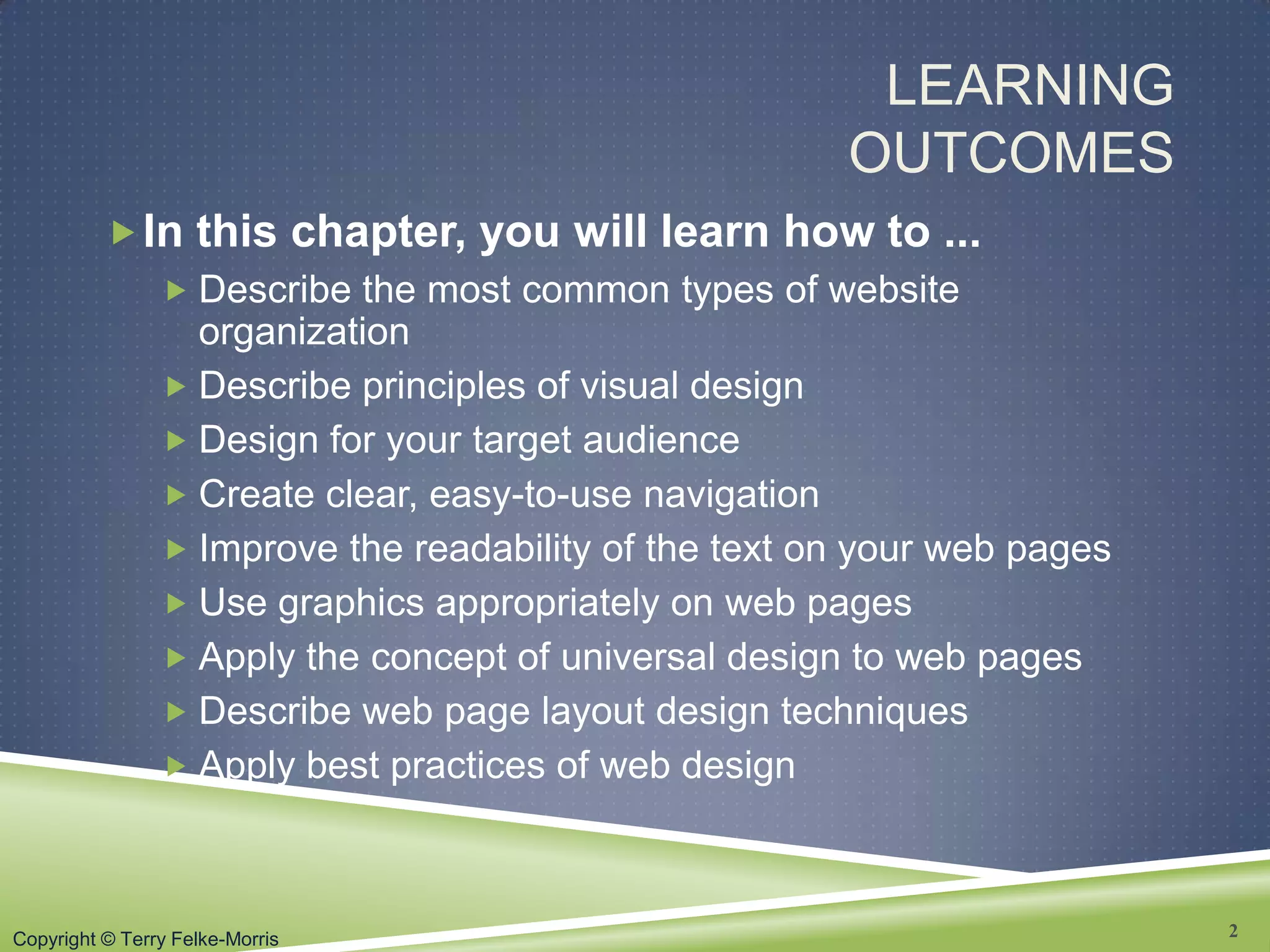 This chapter discusses best practices for web design, including website organization, visual design principles, accessibility, writing for the web, and page layout techniques. It emphasizes designing for the target audience and principles like repetition, contrast, proximity and alignment. Guidelines are provided for text readability, color choices, graphics, navigation, and ensuring designs work across browsers and devices. The goal is to create easy to use, universally accessible websites that load quickly.