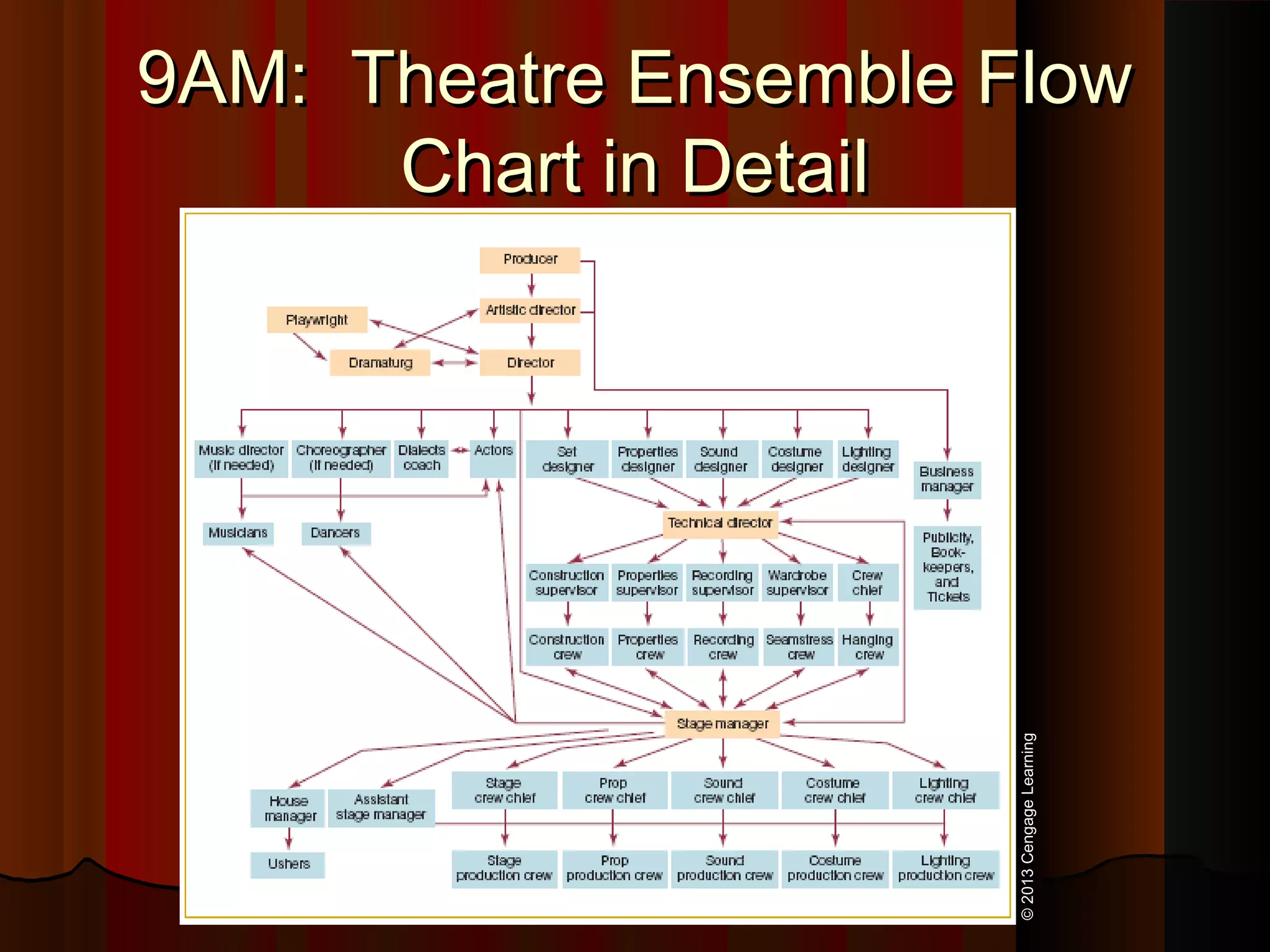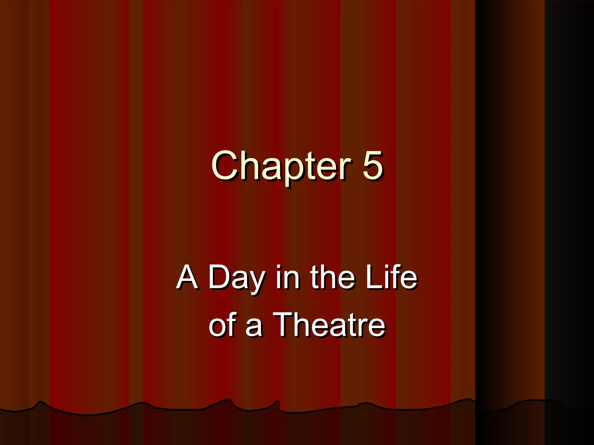 The document provides a summary of a day in the life of a theatre. It describes the various roles that make up a theatre ensemble and what they do throughout the day. In the morning, artistic and production meetings take place to plan creative vision and finances. Rehearsals begin in the morning with the stage manager assisting the director. Costume construction happens at noon. The afternoon involves design work from musical directors, choreographers, and others. Evening activities include actors arriving for the show, an audience filling the house, and stagehands running the production. The day concludes with a performance and rolling out the ghost light overnight.