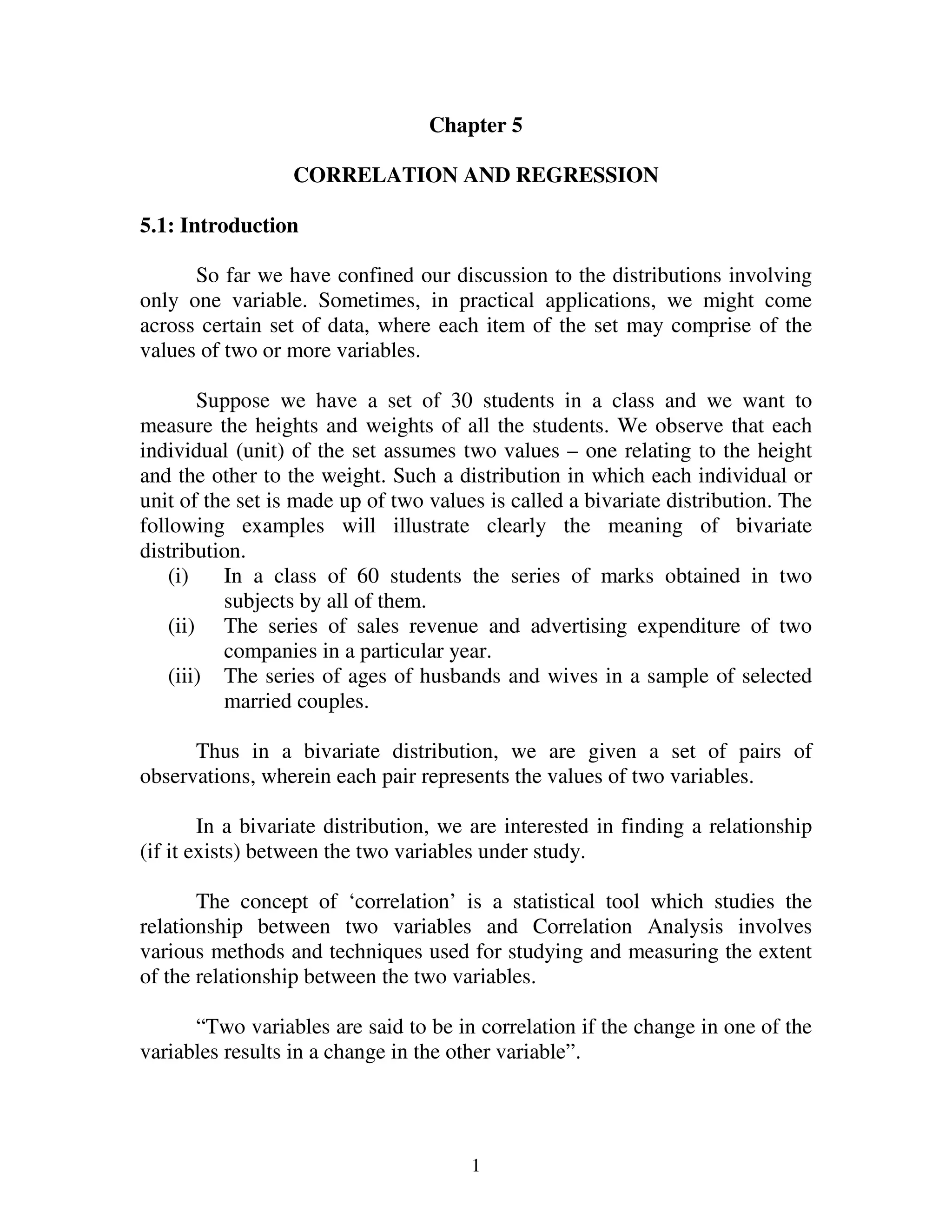 This document discusses correlation and regression analysis. It begins by defining bivariate distribution as a distribution where each data point consists of values for two variables. Correlation analysis studies the relationship between two variables. Positive correlation means the variables increase or decrease together, while negative correlation means they change in opposite directions. Linear correlation means a constant change in one variable corresponds to a change in the other, while non-linear correlation means the relationship is not constant. The coefficient of correlation r measures the strength of the linear relationship between -1 and 1. Rank correlation uses the ranks of data values rather than the actual values.