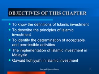 The document discusses the principles of Islamic investment according to Sharia law. It defines Islamic investment as investing in financially and ethically permissible ways according to Islamic rules. The principles require investments to be in ethical sectors and involve profit and risk sharing between investors and businesses. The document also outlines prohibited activities like interest, uncertainty, gambling and unethical industries. It then discusses the implementation of Islamic investment in Malaysia through various Islamic financial institutions and regulatory bodies.
