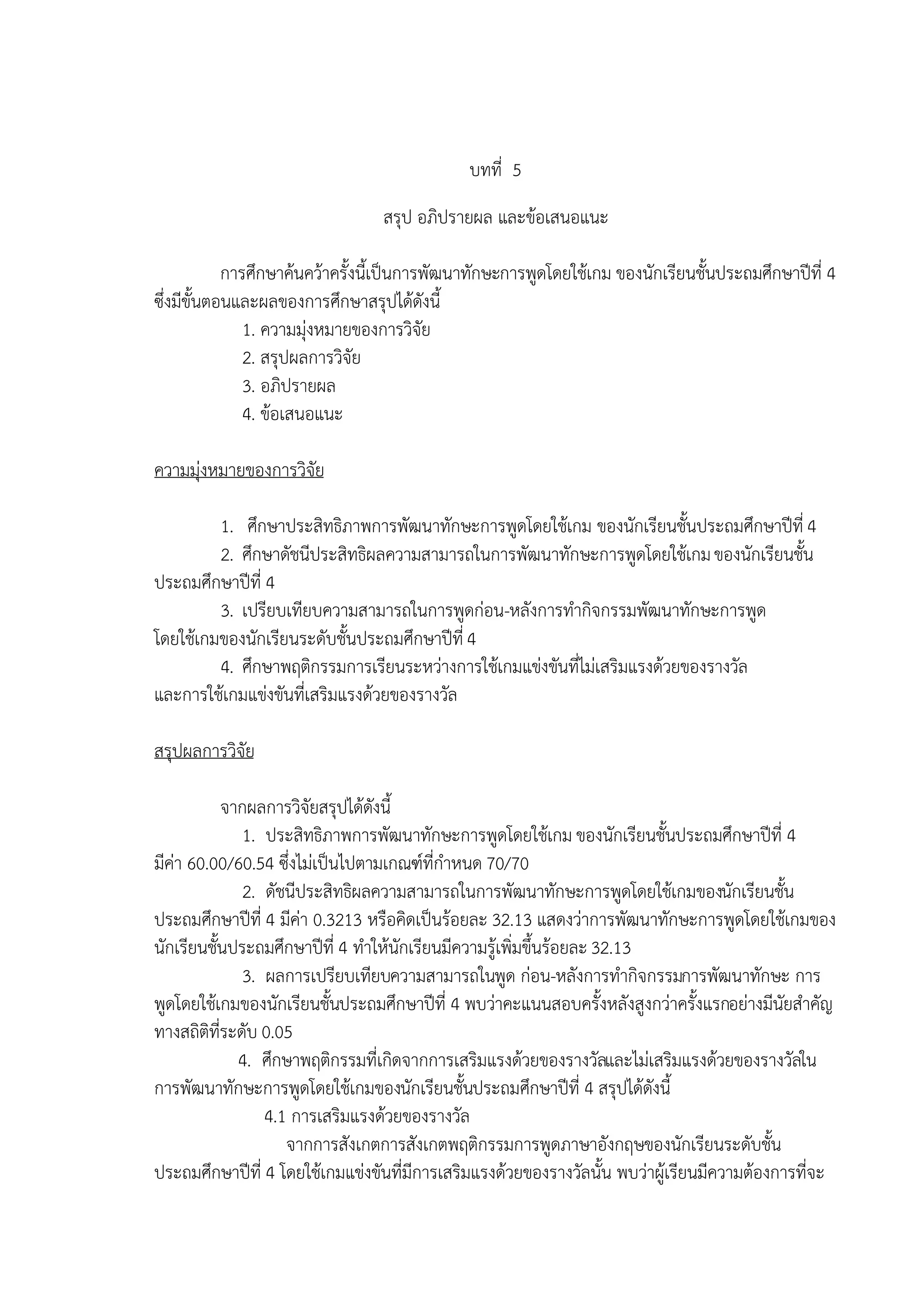 บทที่ 5 สรุป อภิปรายผล และข้อเสนอแนะ การศึกษาค้นคว้าครั้งนี้เป็นการพัฒนาทักษะการพูดโดยใช้เกม ของนักเรียนชั้นประถมศึกษาปีที่ 4 ซึ่งมีขั้นตอนและผลของการศึกษาสรุปได้ดังนี้ 1. ความมุ่งหมายของการวิจัย 2. สรุปผลการวิจัย 3. อภิปรายผล 4. ข้อเสนอแนะ ความมุ่งหมายของการวิจัย 1. ศึกษาประสิทธิภาพการพัฒนาทักษะการพูดโดยใช้เกม ของนักเรียนชั้นประถมศึกษาปีที่ 4 2. ศึกษาดัชนีประสิทธิผลความสามารถในการพัฒนาทักษะการพูดโดยใช้เกม ของนักเรียนชั้น ประถมศึกษาปีที่ 4 3. เปรียบเทียบความสามารถในการพูดก่อน-หลังการทากิจกรรมพัฒนาทักษะการพูด โดยใช้เกมของนักเรียนระดับชั้นประถมศึกษาปีที่ 4 4. ศึกษาพฤติกรรมการเรียนระหว่างการใช้เกมแข่งขันที่ไม่เสริมแรงด้วยของรางวัล และการใช้เกมแข่งขันที่เสริมแรงด้วยของรางวัล สรุปผลการวิจัย จากผลการวิจัยสรุปได้ดังนี้ 1. ประสิทธิภาพการพัฒนาทักษะการพูดโดยใช้เกม ของนักเรียนชั้นประถมศึกษาปีที่ 4 มีค่า 60.00/60.54 ซึ่งไม่เป็นไปตามเกณฑ์ที่กาหนด 70/70 2. ดัชนีประสิทธิผลความสามารถในการพัฒนาทักษะการพูดโดยใช้เกมของนักเรียนชั้น ประถมศึกษาปีที่ 4 มีค่า 0.3213 หรือคิดเป็นร้อยละ 32.13 แสดงว่าการพัฒนาทักษะการพูดโดยใช้เกมของ นักเรียนชั้นประถมศึกษาปีที่ 4 ทาให้นักเรียนมีความรู้เพิ่มขึ้นร้อยละ 32.13 3. ผลการเปรียบเทียบความสามารถในพูด ก่อน-หลังการทากิจกรรมการพัฒนาทักษะ การ พูดโดยใช้เกมของนักเรียนชั้นประถมศึกษาปีที่ 4 พบว่าคะแนนสอบครั้งหลังสูงกว่าครั้งแรกอย่างมีนัยสาคัญ ทางสถิติที่ระดับ 0.05 4. ศึกษาพฤติกรรมที่เกิดจากการเสริมแรงด้วยของรางวัลและไม่เสริมแรงด้วยของรางวัลใน การพัฒนาทักษะการพูดโดยใช้เกมของนักเรียนชั้นประถมศึกษาปีที่ 4 สรุปได้ดังนี้ 4.1 การเสริมแรงด้วยของรางวัล จากการสังเกตการสังเกตพฤติกรรมการพูดภาษาอังกฤษของนักเรียนระดับชั้น ประถมศึกษาปีที่ 4 โดยใช้เกมแข่งขันที่มีการเสริมแรงด้วยของรางวัลนั้น พบว่าผู้เรียนมีความต้องการที่จะ