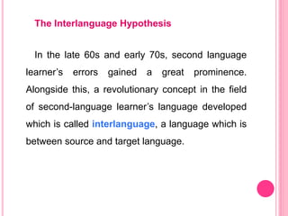 The document discusses hypotheses about second language learners' language development. It describes the interlanguage hypothesis proposed by Larry Selinker, which posits that learners develop an "interlanguage" between their native and target languages. This interlanguage is systematic and evolving. Selinker identified five processes in second language learning: language transfer, overgeneralization, transfer of training, learning strategies, and communication strategies. The document also discusses the approximative system hypothesis and the notion of learners developing idiosyncratic dialects that blend features of their native and target languages.