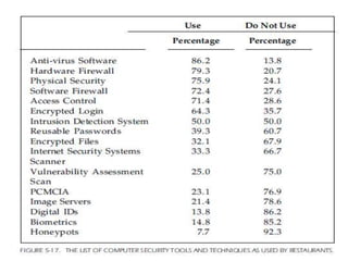 This document discusses managing and securing information systems in hospitality organizations. It covers the importance of computers, identifying mission critical systems like reservation and POS systems, maintaining these systems, common causes of system failure, and strategies for disaster recovery and business continuity planning. It also discusses security challenges like viruses, spyware, and data encryption. PCI compliance for payment card data is explained.