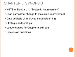 This chapter discusses the importance of systemic change with technology through strategic partnerships and personnel. It emphasizes: