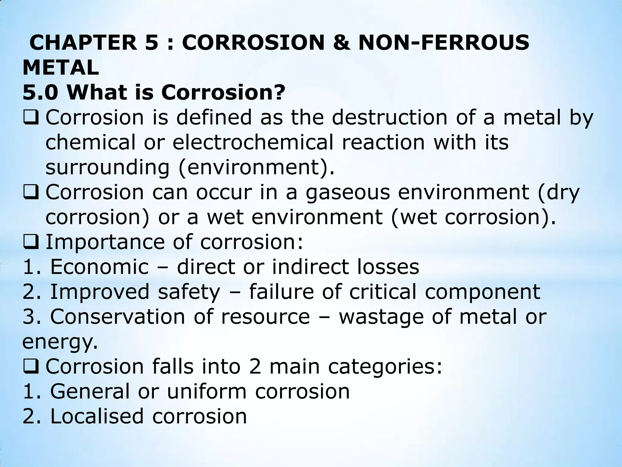Corrosion is the destruction of metals through reaction with the environment. It can occur in dry or wet environments and causes economic and safety issues. There are two main types of corrosion: general/uniform corrosion, which occurs at the same rate over the entire surface, and localized corrosion, which affects only certain areas. Methods of preventing corrosion include proper material selection, protective coatings like paint and plating, cathodic protection, and design considerations. Non-ferrous metals are metals that do not contain much iron and include aluminum, copper, zinc, and others which are used due to properties like corrosion resistance.