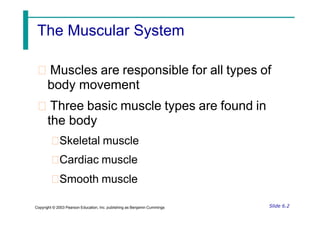 The document provides an overview of the muscular system, detailing the three types of muscles: skeletal, cardiac, and smooth, along with their characteristics and functions. It explains muscle structure, the sliding filament theory of contraction, and the energy pathways for muscle activity, including aerobic and anaerobic processes. Additionally, it covers muscle contractions, fatigue, movement types, and methods for naming skeletal muscles.