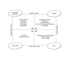 Agile testing is a continuous testing practice that aligns with agile software development principles, focusing on collaboration among developers, testers, and business analysts to ensure high-quality software delivery. Key methods include Behavior Driven Development (BDD), Acceptance Test-Driven Development (ATDD), and exploratory testing, each aimed at improving communication, user involvement, and adaptability to changes. Benefits of agile testing include time and cost savings, reduced documentation, regular feedback, but it can also lead to unpredictability in requirements and increased expenses due to frequent releases.