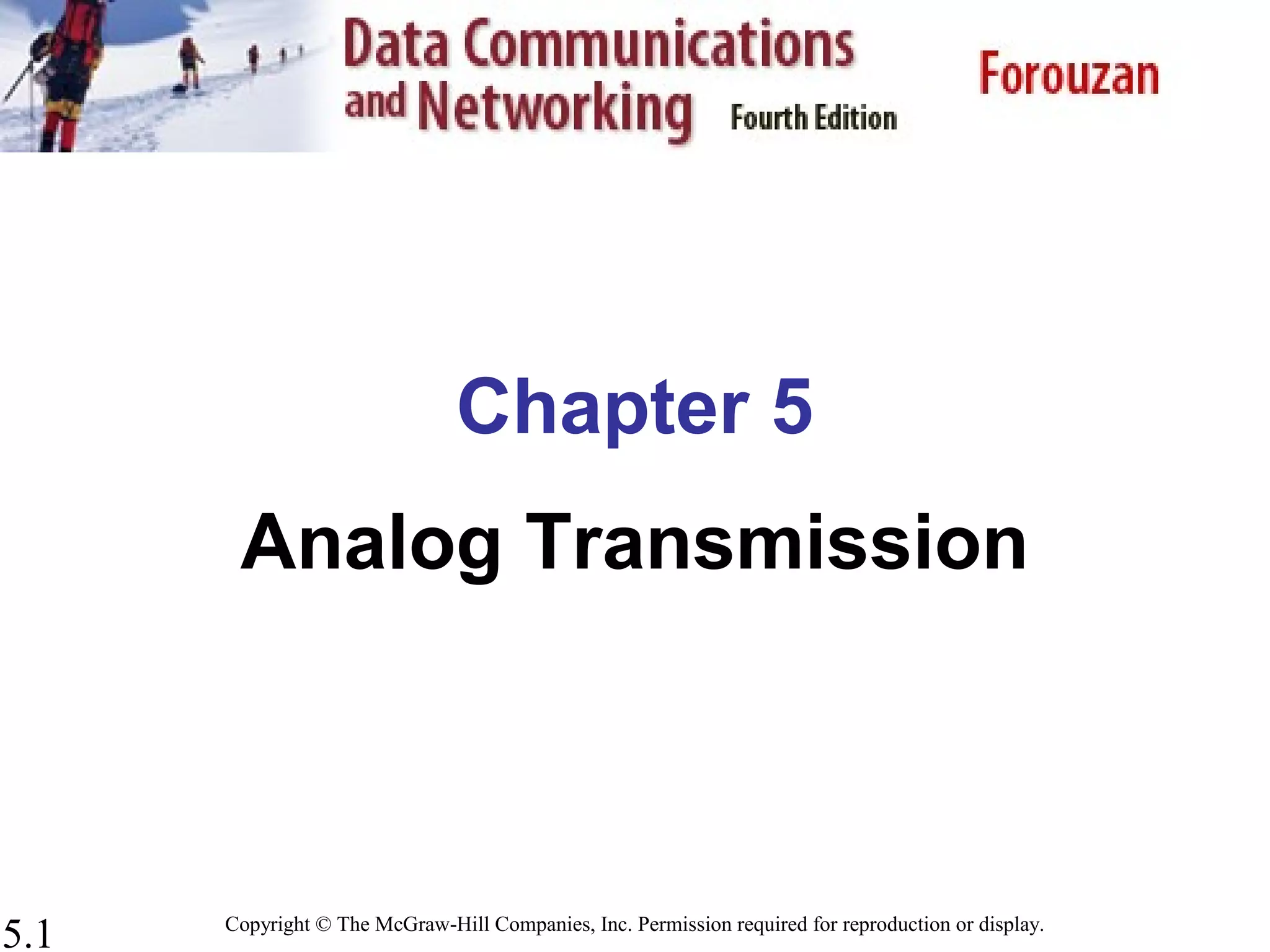 This document discusses various analog transmission techniques for transmitting digital data. It covers digital-to-analog conversion methods like amplitude shift keying, frequency shift keying, and phase shift keying. It also discusses analog modulation techniques like amplitude modulation, frequency modulation, and phase modulation. It provides examples of how to calculate bit rates, baud rates, and bandwidth requirements for different modulation schemes. Key concepts like constellation diagrams are also introduced.