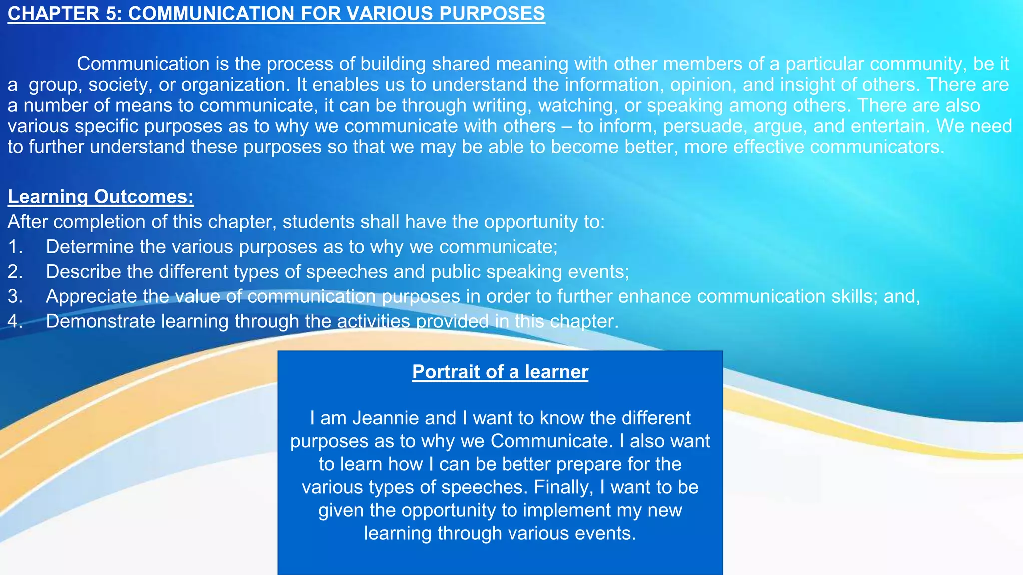 The document discusses communication for various purposes. It explains that communication allows people to understand each other and share information, opinions, and insights. There are different means of communication, such as writing, speaking, and watching. It also discusses the various specific purposes of communication, such as to inform, persuade, argue, and entertain. The chapter aims to help students understand these different communication purposes to enhance their skills. [/SUMMARY]